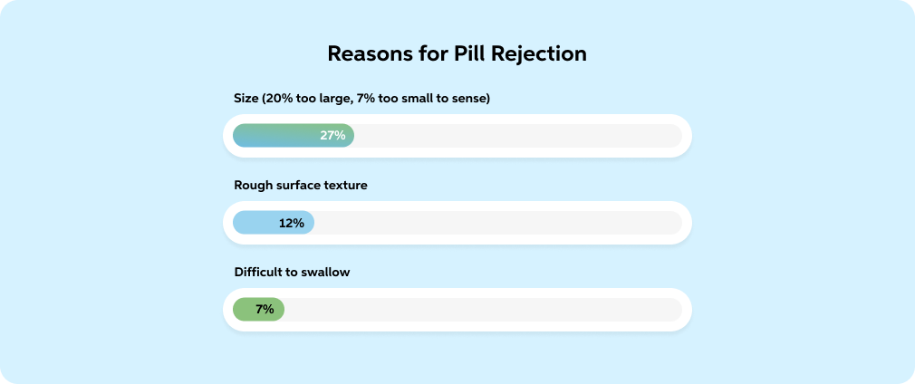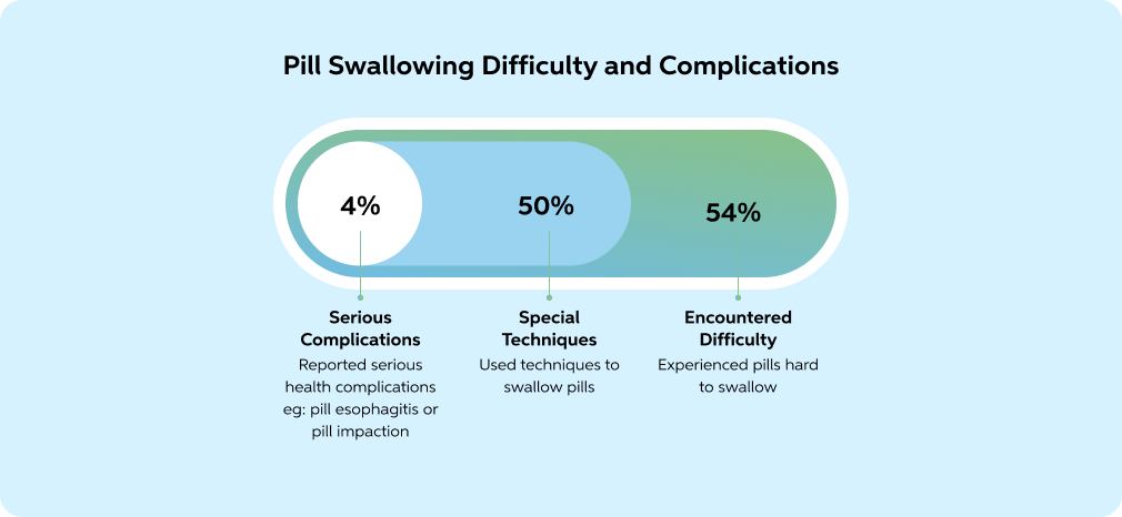 Surveys show that nearly 50% of patients experience dysphagia or discomfort when swallowing tablets or capsules. Pill-specific dysphagia affects ~14%. Around 18% had difficulty swallowing tablets without training. Patients frequently resort to splitting, crushing, or dissolving tablets-behaviours that compromise safety, alter pharmacokinetics, and risk subtherapeutic dosing.