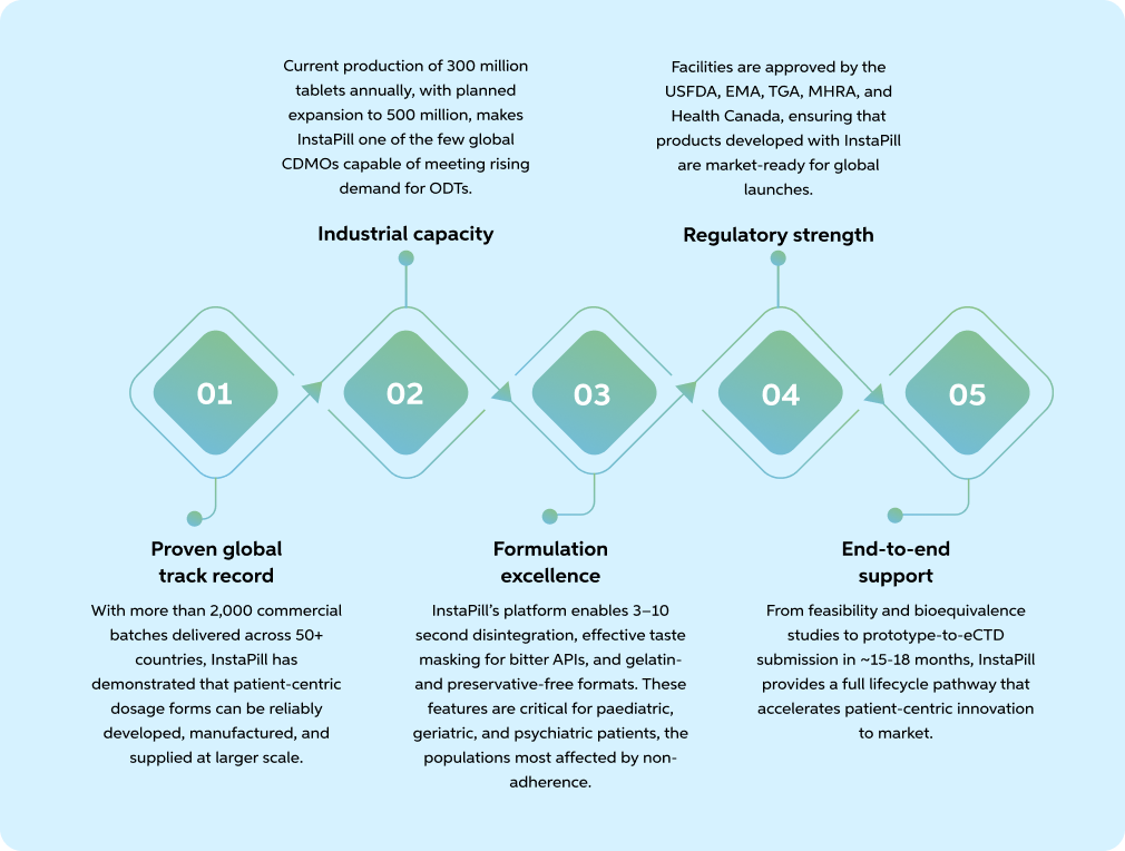 - 5. InstaPill delivers ODTs at a global scale: With >2,000 batches across 50+ countries, 300 million+ tablets annually (expanding to 500 million), and a fully compliant, vegan, preservative-free platform, InstaPill enables pharma partners to turn adherence into a competitive advantage.